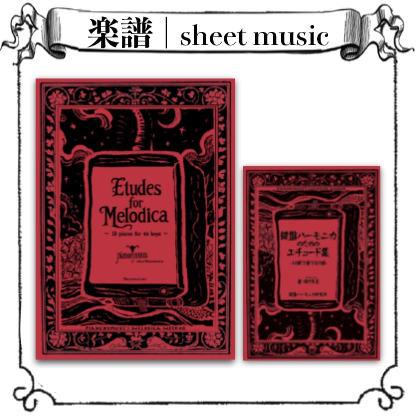 楽譜『鍵盤ハーモニカのためのエチュード集 〜44鍵で奏でる13曲〜』(英名:Etudes for Melodica -13 Pieces for 44 Keys- )は、「ブルグミュラー」のような親しみやすさを目指し、キッチュで遊び心のあるオリジナル楽曲13曲を44鍵盤用に書き下ろしました。